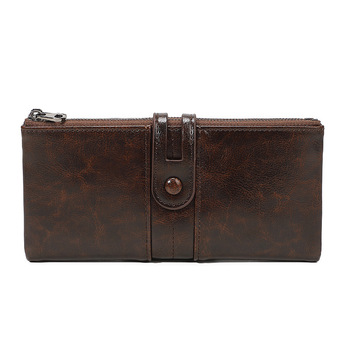 Lady Oil Wax Leather Soft Leather Long Clutch Estilo vintage Cartera de mujer RFID Bordado Decoración Tarjetas DE CRÉDITO Cartera delgada